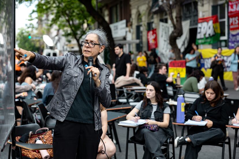 Son dos profesores y dictan una clase de historia argentina a una veintena de alumnos. Ambos tienen carteles colgando del cuello: “docente bajo la línea de pobreza”, dice el de él; “docente hija de trabajadores”, dice el de ella. Los estudiantes se esfuerzan por escucharlos y seguir el hilo de sus explicaciones al sol del mediodía, mientras a unos pocos metros pasan autos y ómnibus, más cerca otros profesores enseñan otras materias. Son todas clases públicas, dictadas a la intemperie, sobre la calle que permanece cortada al tránsito, los pupitres desperdigados sobre el asfalto frente a la Facu...