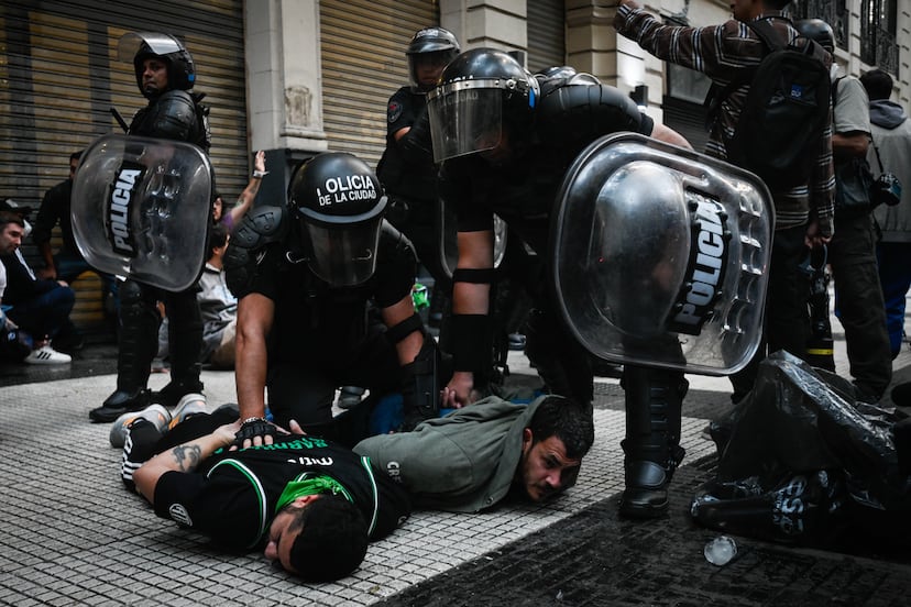 En Argentina ya no hay levantamientos militares, sino de hinchas de fútbol. Al menos de eso está convencido el Gobierno de Javier Milei, que un día después de una violenta marcha de jubilados celebrada frente al Congreso el miércoles denunció “una especie de golpe de Estado” perpetrado, dijo, por “barrabravas” apoyados por el peronisno kirchnerista. La tesis la defendió sin pruebas el jefe de Ministros, Guillermo Francos. La ministra de Seguridad, Patricia Bullrich, fue más precisa: acusó a los jefes comunales de La Matanza y Lomas de Zamora, dos distritos populares del extrarradio de la ciudad de Buenos Aires, vinculados a la expresidenta, Cristina Kirchner. En la Casa Rosada no creen que la docena de hinchadas de equipos de fútbol que se sumó a la protesta que los jubilados realizan cada semana haya sido inocente. La marcha terminó en una guerra entre manifestantes y policías, con un centenar de detenidos y una veintena de heridos, entre ellos un fotógrafo “kirchnerista”, como lo tildó Bullrich, que está al borde de la muerte por el impacto de una bomba de gas en la cabeza. Los incidentes, los más graves desde que Milei asumió en diciembre de 2023, no han producido nada parecido a un golpe de Estado, pero sí pusieron en evidencia que el Gobierno ultra ya no tiene el control total de la calle.