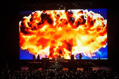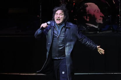 “Dame fuego, dame el fuego de tu amor”, cantó Javier Milei con la voz ronca, enfundado en cuero negro y el cabello ensortijado ante 15.000 personas que lo aclamaban en los límites del éxtasis colectivo en el estadio Movistar Arena de Buenos Aires. Ese fuego, que hace 50 años reclamaba con movimientos pélvicos el músico argentino Sandro, es el que fue a buscar el presidente entre su gente tras un mes en el que recibió una paliza electoral del peronismo, pidió un rescate financiero a Donald Trump y perdió a su candidato estrella a diputado por vínculos con el narco. ¿Cómo definir lo que se vivió este lunes por la noche en Buenos Aires? La presentación de un libro, titulado sin temor La construcción del milagro, fue la excusa de Milei para un recital de rock que fue también un acto de campaña, un gigantesco karaoke con esos temas “que sabemos todos” y un subidón de adrenalina indispensable para superar el mal momento.