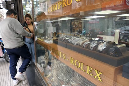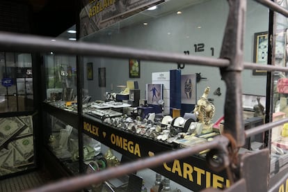 Hay una opción más, mucho menos visible, y es la preferida de los que llegan para vender relojes robados: departamentos que funcionan como oficinas, atendidos por los llamados reducidores, todos sobre la misma calle Libertad. Llegar a ellos no es para cualquiera. Hay que conocerlos o ser recomendado por gente de su confianza. Solo así abren las puertas. Por lo general, también se dedican a la compra y venta ilegal de divisas y algunos invierten en personal de seguridad. Mientras EL PAÍS recorre la zona, unos cuantos comerciantes salen a la vereda. Algunos preguntan el motivo de las fotos y otros se limitan a observar, notoriamente incómodos, los movimientos del fotógrafo y cronista.