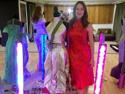 Una serie de vestidos robóticos desfilaron en la Semana de la Moda de Nueva York, incluido uno con apliques de hojas metálicas en un hombro que se agitan y tintinean cuando alguien se acerca demasiado.