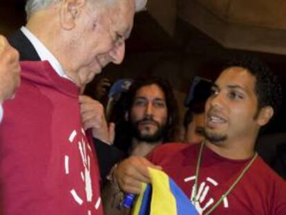 La entrega de una bandera de Venezuela y una camiseta con la insignia del movimiento universitario opositor conmueve al escritor. “Ha sido más emocionante que recibir el Nobel”