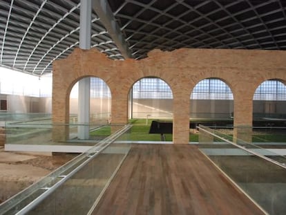 En un paisaje de horizonte limpio se ve el edificio que Pedrosa y Paredes idearon para cubrir las ruinas de la villa romana de La Olmeda. En el interior de su edificio de principios del siglo XXI, la villa del siglo IV parece preservada como dentro de un cofre