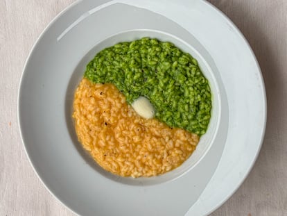 Con purés concentrados de verduras que se preparan en un abrir y cerrar de ojos puedes teñir y dar sabor al arroz de un risotto como este