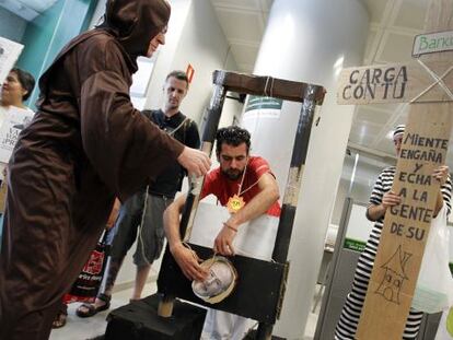 Miembros de la PAH corta un chorizo con la cara de Rato con una guillotina en una sucursal Pretenden conseguir una dación en pago o alquiler social para el afectado del desalojo