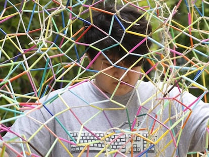 El artista adolescente Adriano Souras presenta en el Museo de Chicago ‘The Killer Net’, una red de pescador hecha con más de 9.000 de estos elementos recuperados del medio ambiente