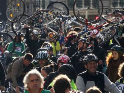 Grupos de ciclistas recorren la ciudad para secundar la huelga y reivindicar el uso de la bicicleta Un grupo de 15 activistas será imputado por conducta temeraria al cortar la M-30