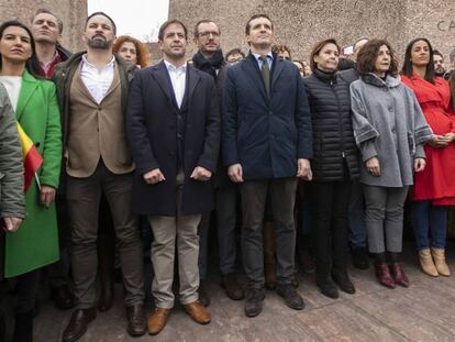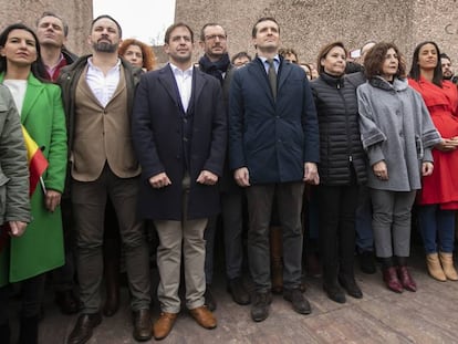Casado, Rivera y Abascal posan juntos por primera vez y acusan a Sánchez de ceder a las 21 condiciones de Torra