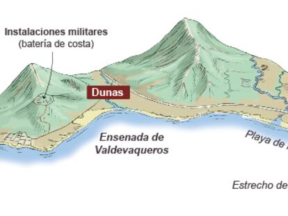 Una montaña de arena engulle la carretera de acceso a un poblado gaditano Los militares alteraron el sistema en 1940 para prevenir un desembarco desde Gibraltar
