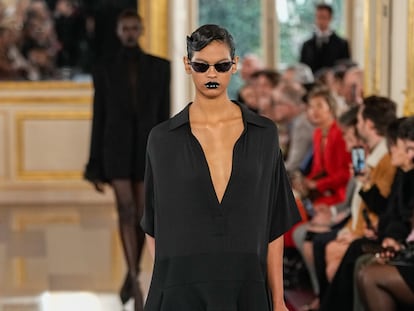 El director creativo de la firma, Maximilian Davis, se decanta por enfrentar sastrería y sensualidad con abrigos y trajes ‘oversized’ frente a vestidos en diferentes texturas y grados de transparencia