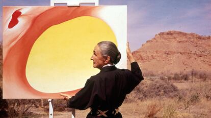 Georgia O’Keeffe está tan sola en el arte del último siglo como lo estaba en su retiro de Nuevo México, donde empezó pasando veranos y otoños y acabó quedándose de manera permanente, habitando una casa de arquitectura tan desnuda como las osamentas que le gustaba pintar en un estudio con un ventanal desmesurado de cinco metros de largo en el que cabía entera la inmensidad del paisaje. En una foto se la ve de espaldas, desde lejos, caminando por el lomo de un cerro árido, seguida por un perro. En otras que le hizo Alfred Stieglitz, mentor primero y luego cómplice, amante clandestino que después fue su esposo, se la ve por otro paisaje igual de desértico llevando a pulso un lienzo ya montado en un bastidor, con un aspecto más de exploradora que de pintora. Georgia O’Keeffe había vivido hasta los 12 años en una casa en mitad de una pradera en Minnesota, rebosante de fertilidad vegetal en los veranos y en los inviernos batida por las tormentas de nieve. Esas amplitudes que una imaginación europea no sabe concebir las llevó consigo cuando fue a estudiar arte en Chicago, aventajada y muy pronto innovadora, tanteando desde muy joven las formas del cuerpo femenino y las concisas abstracciones que ya perseguían la médula desnuda de lo real.