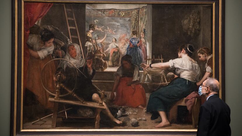 A Las hilanderas se les añadió un pedazo por cada costado tras la muerte de Velázquez. Durante más de dos siglos, el cuadro tuvo una bóveda con un ojo de buey, una cortina roja enorme y una puerta lateral con un respiradero enrejado. Hace unos días, el Museo del Prado presentó un marco ingeniosísimo, que permite tapar los añadidos para que la obra se vea “tal y como la concibió el maestro”.