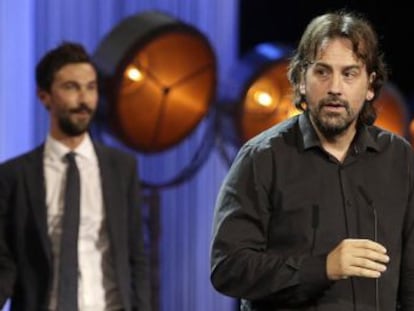 En el pasillo que une el salón a la sala en la que trabajan Lacuesta y Campo, hay restos de estas contradicciones. Al visitante le flanquean a los pies y pegados a las dos paredes, los premios logrados por ambos. Y los trofeos recuerdan que el gerundense ganó dos Conchas de Oro —por Los pasos dobles en 2011 y Entre dos aguas en 2018—, el máximo galardón del festival de San Sebastián, antes de ser por primera vez candidato al Goya. Se le etiquetó de autor antes que industria. “Y eso que he rodado bastante publicidad, incluso campañas grandes. No me preguntes cuáles eran...”. Un cabezón adornado con una careta dibujada por su hija Luna testimonia que sí lo obtuvo la segunda vez que compitió por un trofeo de la Academia de Cine, el del mejor guion adaptado por Un año, una noche, coescrito con Campo y Fran Araújo. Fue una película nacida del encargo de un productor, Ramón Campos, que estaba en París con su familia la noche de los atentados en la sala de conciertos Bataclan y en otros bares.
