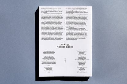 Durante los días que siguieron a los dramáticos sucesos, Cases fue encontrando algunos ejemplares de los fotolibros que había ido atesorando con los años. Desperdigados en un radio de unos 300 metros, permanecían, empapados y cubiertos de tierra húmeda, unos pocos volúmenes que habían alimentado el ansia creativa y estimulado la trayectoria artística del autor. Los llevó a su jardín. De forma instintiva, decidió reproducirlos. Volverlos a ver por última vez antes de que sus páginas quedaran pegadas para siempre. En un banco, fue fotografiando sus hojas. De ahí, surgió Catálogo, una publicación que transforma la tragedia en un poderoso y poético ensayo visual sobre la creación, la memoria y la pérdida: una reflexión que convierte el barro, la destrucción y el caos en una metáfora de resiliencia. Más que un catálogo, se erige como un autorretrato en el que la naturaleza se encarga de reescribir la historia.