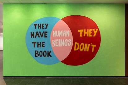 Las acuarelas de arlequines, cicerones del infierno y cínicos bufones, están enmarcadas en lujoso dorado y nos hablan desde bocadillos de tebeo. Uno dice “Quiero una democracia a mi manera”, otro se graba a sí mismo bajo el título “Baudrillard intentando explicar sus fotos a su vídeo personal”. Otro, con la mano amputada, intenta hacer el saludo nazi. Frente a ellos, gigantescos murales componen deformados diagramas de Venn. Uno de ellos incluye los elementos “hombre blanco” (en el centro); en torno a él, los conjuntos “guerra, piratería, comercio”; y, rodeándolos, los lemas “exportan la democracia, defienden la libertad, filantropía”. La siguiente sala continúa el juego a través de potentes obras donde luminosos iconos hechos de teselas de papel esconden amargas reflexiones. Los tigres simbolizan la violencia individual y la brutalidad masculina, mientras decenas de manos distribuidas por toda la pared ensayan al unísono gestos fascistas.