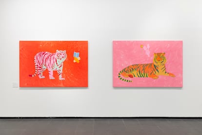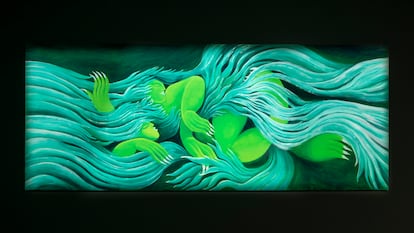 Algunos de los esmaltes, burbujeantes sobre la superficie cerámica, recuerdan a escamas de reptil o a esporas. Este paisaje poshumano sitúa la obra de Zenha entre algunas vías del arte contemporáneo que se interroga por lo queer desde una recuperación de la naturaleza más allá de lo humano. Pero también es un emocionante alegato por una visión artesana, muy trabajada, de la práctica artística. La última sala también termina con lienzos de gran tamaño y refulgente colorido, en una coincidencia muy elocuente con la exposición de Juan Pérez de la planta superior. Nos vemos rodeados de unas criaturas de fulgor tóxico —los lienzos parecen recién pintados de tanto que brillan—; ajenas, se enredan en un continuado abrazo. Esta singular orgía quizá quiera recordarnos que tal vez sea ahí, entre los desechos que se niegan a la tiranía de la identificación y el reconocimiento, donde puede estar el mejor de los refugios.