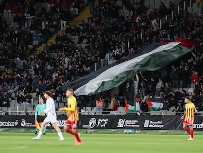 El Estadi Olímpic Lluís Companys acoge un encuentro al que acuden 30.018 personas entre solidaridad, banderas, homenajes y cánticos por el pueblo palestino, y también por la independencia catalana