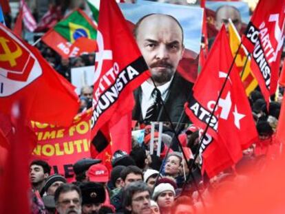 En la marcha, entre las banderas de la URSS y las imágenes de Lenin y Stalin, podían verse algunas banderas catalanas, esteladas rojas y esteladas azules