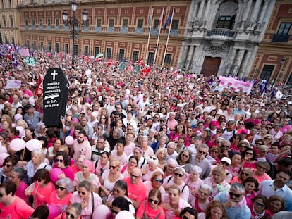 Asociaciones de pacientes oncológicas de Andalucía desbordan el Palacio de San Telmo en contra de la gestión de Moreno y para exigir una respuesta clara y rápida a la crisis
