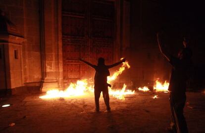 Els radicals van pintar la porta amb aerosol, la van colpejar amb pales i tanques, i fins i tot van arribar a intentar incendiar-la. Per moments, les flames cremaven la fusta. Aquest grup descontrolat, al voltant d'una dotzena de joves, va ser el punt de caos d'una manifestació cívica.