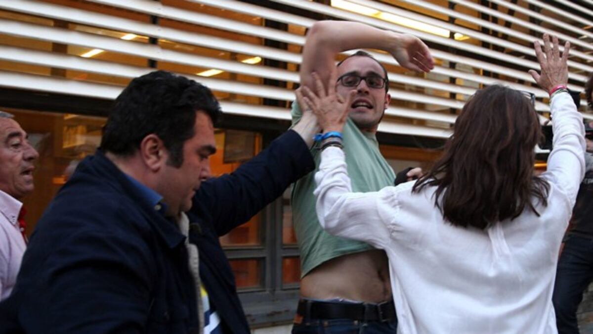 Rajoy ha hagut d'interrompre el seu discurs en les diverses ocasions en què els activistes antidesnonaments han irromput per escenificar el seu malestar. Han estat insultats de totes les maneres possibles i tots han rebut cops de bandera llevat d'un home gran, potser perquè els irats jubilats del PP s'hi han vist identificats. Cap dels agressors era el prototípic militant de mocassí del PP, amb excepció d’Esteban Gesa, candidat a Sabadell; més aviat era una cosa del seu braç proletari. A fora, la policia superava en nombre els seguidors de la PAH. Es repetien els visques a Espanya, en algunes ocasions per celebrar els vídeos promocionals del partit, en d'altres per respondre als crits de protesta que arribaven des del carrer.
