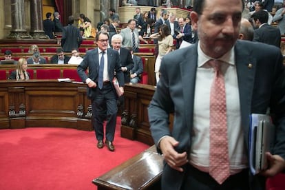 Amb aquest panorama damunt de la taula, el president català, Artur Mas, va haver de sotmetre's ahir a una incòmoda sessió de control al Parlamento català. Ho va fer envoltat encara dels tres consellers d’Unió ja dimitits però que es mantindran en el càrrec fins que dilluns que ve es dugui a terme la reestructuració del Govern .