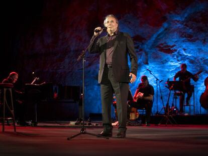 Amb molta cura, com si fos aquell somni que “hay que andarlo de puntillas, por no romper el hechizo”, comença a cantar. I sí, li tremola el cor a la gola, com diu Joaquín Sabina, quan irromp amb Cançó de bressol i li segueix tremolant quan passeja per l’escenari amb Temps era temps, emocionant els més nostàlgics i mirant al cel quan recorda l’Helena Francis. Es posa seriós quan canta Niño silvestre, i sorneguer amb Algo personal. “Ets collonut!”, de nou, la veu del públic. Hi ha confiança. “Et reconec per la veu, tu has vingut cada dia…” Converses que alimenten el presumpte desordre. I que el fan equivocar (serà possible?) quan els músics, amb Ricard Miralles i en Kitflus al capdavant, s’arrenquen amb Pueblo blanco i ell decideix que no, que no toca, i passa a No hago otra cosa que pensar en ti.