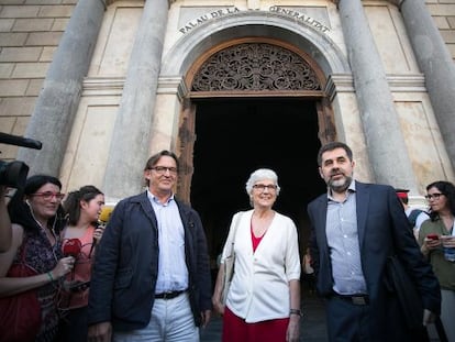 A les set de la tarda compareixen davant dels mitjans els representants de les entitats civils independentistes. Una noia de Badalona pregunta “qui és el barbes” –Jordi Sànchez–. Una adolescent del grup opina que és l’alcalde. Una francesa explica al seu marit que és “una cosa d’associacions catalanes”. De tant en tant apareix algú amb un emblema de l’estelada. Una parella es fa un selfie davant la porta del Palau aixecant els quatre dits de la mà com si fossin les quatre barres.