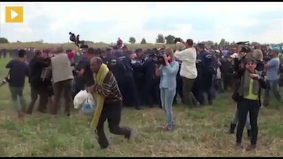 La crisi dels refugiats sirians ens ha deixat grans gestos de solidaritat… i també alguns moments menys bonics. Dimarts a la tarda es distribuïa a través de xarxes socials el vídeo del moment en què un grup de refugiats sirians intentava trencar un cordó de seguretat a la ciutat de Röszke, a Hongria, prop de la frontera amb Sèrbia. El que ha cridat l'atenció d'aquest enregistrament és un moment en què sembla que una reportera de televisió d'un mitjà vinculat a l'extrema dreta fa la traveta a un dels refugiats, que corre amb un nen en braços.