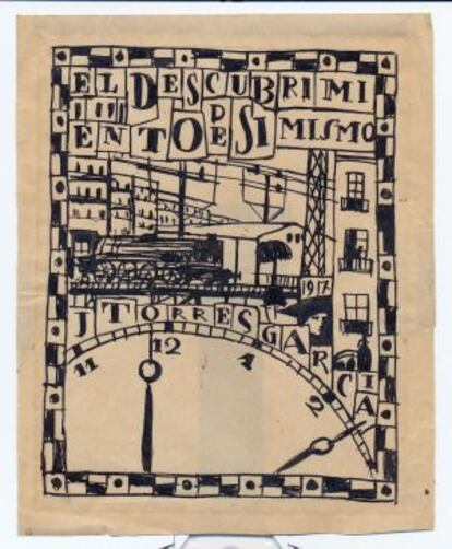 L’etapa catalana figura al pròleg de l’exposició, amb un dels primers autoretrats, alguns dibuixos de l’etapa modernista del tombant de segle, els esbossos i un dels frescos de la Generalitat, un fragment del gran fris de la Casa Rialp, del 1905 (que fa uns anys comprà a Barcelona el Museo Reina Sofía, que el té a la seva exposició permanent), els essencials tres llibres catalans de Torres-García (Notes sobre art, 1913; Diàlegs, 1915, i El descubrimiento de sí mismo, 1917), un parell de construccions arquitectòniques clàssiques fetes en fusta, una esquemàtica natura morta, un collage procedent de l’IVAM que connecta directament amb l’obra dels dadaistes, i diverses vistes de Barcelona de 1917 i 1918, que enllacen amb les de Nova York i que marquen el camí directe emprès cap a la modernitat. S’havia pensat d’incloure més obra d’aquest període, sobretot pintura mural, com els frescos de Mon Repòs (la casa que dissenyà per a ell i la família als afores de Terrassa, el 1914), uns frescos exultants, avui propietat de la Fundació Antiga Caixa Terrassa, o els de la casa del mecenes i amic de l’artista, Emili Badiella, que li va encarregar decorar de dalt a baix, pati inclòs, la seva casa de Terrassa, i que molts anys després es van extreure i repartir entre els hereus del propietari. Però a l’hora de la veritat aquests préstecs no han estat possibles.