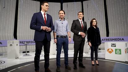 Tres candidats a la presidència del Govern espanyol —Pedro Sánchez (PSOE), Albert Rivera (Ciutadans) i Pablo Iglesias (Podem)— han debatut aquest dilluns sobre els seus programes i propostes a Atresmedia, davant la vicepresidenta del Govern espanyol, Soraya Sáenz de Santamaría, que, en un pla diferent, va defensar la gestió de l'Executiu durant els últims quatre anys, en absència de Mariano Rajoy.