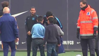 Tots tres, aprofitant-se de les obres que s'estan fent, s'han colat al camp Tito Vilanova de la Ciutat Esportiva Joan Gamper, esquivant totes les mesures de seguretat. Superada la sorpresa inicials, els jugadors, Dani Alves el primer, els han rebut afectuosament, els han convidat a participar en un rondo, s'han fotografiat amb ells i els han mantejat. Cinc minuts han trigat a tornar a la normalitat, fins que Juan Carlos Unzue, el segon entrenador, entre riures, ha donat per acabat el rebombori i ha convidat els nanos a abandonar el camp d'entrenament.