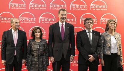 Assegut entre Soraya Sáenz de Santamaría (a la seva dreta) i Carles Puigdemont (esquerra), Felip VI ha presidit la cerimònia de lliurament dels Premis Carlos Ferrer Salat, que premien com a Empresari de l’Any Francisco Javier García Sanz, president del consell d’administració de Seat, per la inversió de 4.200 milions a Espanya compromesos pel fabricant de vehicles. A més, ha reconegut la trajectòria empresarial de Javier Godó, president del Grup Godó. S’han atorgat altres guardons al Grup Indukern, Condis Supermercats, Grup Carinsa i Salgot.