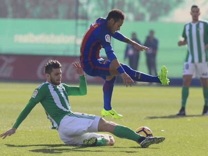 A partir d’un doble pivot (4-2-3-1), i amb Aleix Vidal en una banda i Neymar a l’altra, el Barça va intentar sortir del seu camp i competir per la pilota, propietat del Betis. Tampoc va funcionar, perquè els nois de Víctor del Amo van continuar entestats a fer gol fins que ho van aconseguir amb un córner botat per Durmisi. Ter Stegen el va refusar en curt amb els punys, assetjat per dos rivals, i Álex Alegría va rematar: 1-0. I llavors el partit va embogir fins que va acabar amb l’empat a 1. El Barça va reclamar dos gols en dues jugades en què la pilota es va passar per la línia de meta –la rematada d’Aleix Vidal va traspassar la línia i era gol— abans que Luis Suárez empatés i després que Ter Stegen evités el 2-0.