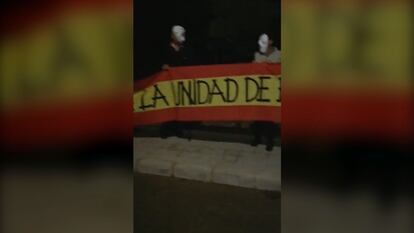 Una vintena de militants d'España 2000 amb màscares despleguen una pancarta a favor de la unitat d'Espanya