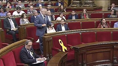 La polèmica per l'ús de llaços grocs a l'espai públic s'ha traslladat al ple del Parlament. El president de la Cambra, Roger Torrent, ha suspès la sessió d'aquest dimecres després que el portaveu de Ciutadans, Carlos Carrizosa, retirés un d'aquests símbols d'un dels escons reservats pel Govern i es negués a tornar-lo a col·locar, tal com havia demanat Torrent. El llaç l'havia posat una diputada de Junts per Catalunya, com a reivindicació dels exconsellers que són en presó preventiva per un suposat delicte de malversació i rebel·lió.