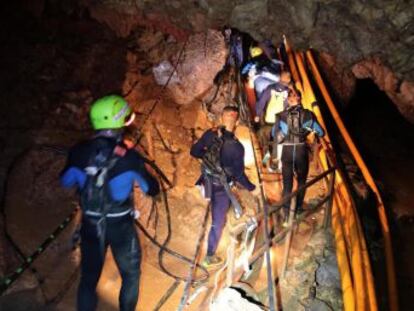 Tot s'havia preparat escrupolosament. Ampolles d'aire al llarg de la ruta. Experts guies als punts més perillosos. Il·luminació en la mesura del possible. I, sobretot, s'havia extret molta de l'aigua que havia inundat la cova, treballant contra rellotge. Cada nen anava escortat per dos bussos d'elit.
