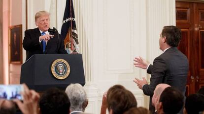 El president dels Estats Units, Donald Trump, i el reporter de la CNN Jim Acosta van protagonitzar aquest dimecres una picabaralla a la Casa Blanca. Durant una roda de premsa que va oferir el mandatari per avaluar els resultats de les eleccions legislatives es van viure diferents moments de tensió.