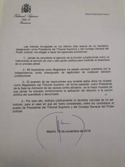 En la carta, Marchena defensa la seva independència i es desvincula de l'acord polític entre el PP i el PSOE per a la renovació de l'òrgan de govern dels jutges pactat fa poc més d'una setmana. "No he concebut mai l'exercici de la funció jurisdiccional com un instrument al servei d'una o altra opció política per controlar el desenllaç d'un procés penal", ha recalcat el magistrat en un comunicat. La decisió de Marchena té una conseqüència directa sobre el judici més important dels últims anys, el del procés. La seva sortida de la sala penal per presidir el Suprem implicava una sèrie de canvis que modificaven el tribunal i permetien una composició amb un progressista més. La renúncia implica que Marchena continuarà al capdavant de la sala que presidirà el judici i que serà, per tant, la figura clau del procés. Els independentistes ja s'havien llançat a criticar Marchena i el Suprem després que es publiquessin els missatges de Cosidó que mostraven aquest intent del PP per controlar aquest judici.