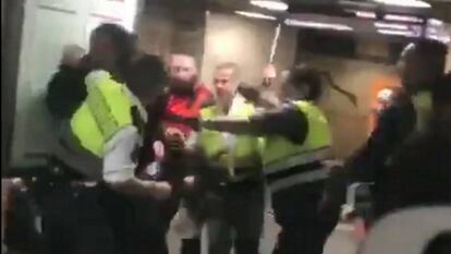Esto acaba de pasar en la estación Plaza de Catalunya (Barcelona) decimos una cosa: la brutalidad con la que golpean todos los vigilantes de seguridad al joven tiene su razón en que es brutalidad racista. Actuavión desproporcional. Contra la pared y todos dándole con la porra. pic.twitter.com/NCS4v3bASz