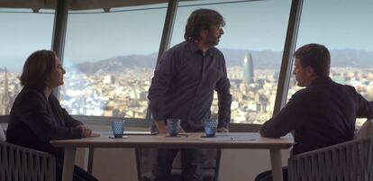 Una dona i un home es troben en una cabina del telefèric de Montjuïc. Ella es diu Ada Colau i és alcaldessa de Barcelona; ell és Manuel Valls, ex-primer ministre de França i rival d'ella en les properes eleccions municipals. L'escena és el preludi del cara a cara que protagonitzaran per al programa de televisió Salvados. Colau i Valls només havien parlat una vegada abans d'aquesta trobada, el 8 de març del 2017, a la llotja del Camp Nou. Darrerament s'han comunicat a còpia d'atacs en forma de tuit o de declaracions a la premsa. La càmera enregistra com s'asseuen junts a la cabina i estableixen un diàleg forçat, impostat, sobre els seus fills i sobre les bondats del telefèric. L'espectador arriba a la conclusió que per exigències del guió han de pretendre que es respecten. Colau mira a Valls quan aquest parla; ell ho evita. A ell se'l veu tens i a ella, nerviosa. Cap dels dos sembla còmode.