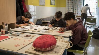 Concentrats al voltant d’una taula de la sala d’estar, en Moussa, l’Abdellah i en Noureddine repassen amb un pinzell el contorn d’unes flors i uns dracs pintats sobre una bossa de roba. Al fons de l’habitació, Hasan retalla trossos de paper per embolcallar les roses de Sant Jordi. Sota la tutela del tallerista del centre, Abraham Moya, els nois, d’entre 15 i 16 anys, fa setmanes que preparen les bosses i l’empaquetat de les flors que avui vendran en un lloc a la plaça de la Bella Dorita, al costat del Molino, al Paral·lel de Barcelona. Els quatre joves són menors tutelats per la Generalitat que viuen al centre d’acollida Coda1, una residència que la Fundació Idea té al barri del Poble-sec.