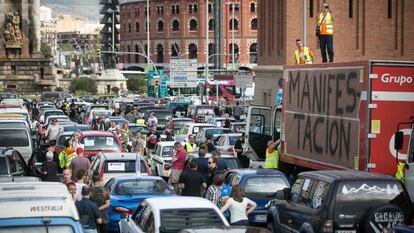Són les deu del matí, i sona un petard potent a la plaça d'Espanya, el senyal perquè els conductors pugin als seus cotxes, motos, camionetes i camions i comenci la manifestació. No serà l'únic que se sentirà al llarg d'un recorregut per la Gran Via que arribarà fins al passeig de Gràcia: clàxons i botzines de cotxes de totes les edats, motors trucats, accelerades, les revolucions a mil. Una simfonia del motor que ahir va reemplaçar, per unes hores, els cartells amb missatges ecologistes de la manifestació del dia abans, que demanaven un món més verd i sostenible.
