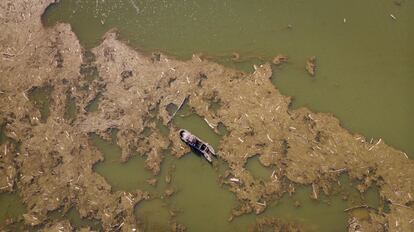Una barca procedent del port de Tarragona ha arribat al pantà de Sau per fer-se càrrec de les tasques de neteja.Carles RibasEl temporal Glòria, que va castigar Catalunya a finals de gener, va provocar la crescuda important de molts rius, entre ells el Ter.Carles RibasDurant el temporal, el riu Ter va arribar a una punta de cabal de 996 metres cúbics per segon i s'anava obrint pas per tota la seva llera, inundant camps, camins i carreteres.Carles RibasLa crescuda del Ter també va causar la caiguda d'una torre de mitja tensió a Bescanó i va deixar 4.000 abonats de Girona sense subministrament elèctric.Carles RibasDurant la crescuda, el riu va arrossegar tones de canyes i restes vegetals, i fins i tot algun animal mort.Carles RibasSegons la Generalitat, només a la zona de la presa del pantà s'acumulen fins a 60 hectàrees de troncs i restes vegetals.Carles RibasDimarts va arribar una petita embarcació des de Tarragona per netejar la brutícia. Un operari que treballa en les tasques de neteja del pantà ha assegurat a aquest diari que necessitaven maquinària més pesada.Carles RibasUn mes després, el pantà de Sau manté un elevat nivell de l'aigua i amb prou feines es pot veure la punta del campanar de l'antiga església.Carles Ribas