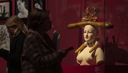 La secció Surrealisme i erotisme és especialment rica, amb fotografies de Lee Miller, de Man Ray (una esplèndida Kiki de Montparnasse), de Dora Maar, de Claude Cahun i on apareixen Peggy Guggenheim amb les seves famoses arracades (una de Calder i una altra de Tanguy), l’excèntrica Leonor Fini i Gala amb el barret-sabata ideat per Elsa Schiaparelli. I sí, els surrealistes “van dissenyar” objectes quotidians, poc pràctics però meravellosament inquietants, com els guants amb venes pintades de vermell, o la polsera de pell de Meret Oppenheim. I el moviment, efectivament, va influir en certs dissenyadors posteriors a la Segona Guerra Mundial. Potser els objectes més coneguts són la taula amb rodes de bicicleta de Gae Aulenti, o el llum fet amb plats trencats d’Ingo Maurer, però també hi ha curiositats com una sorprenent tetera amb la forma d’un crani de porc, obra de l’estudi Wieki Somers (2003).