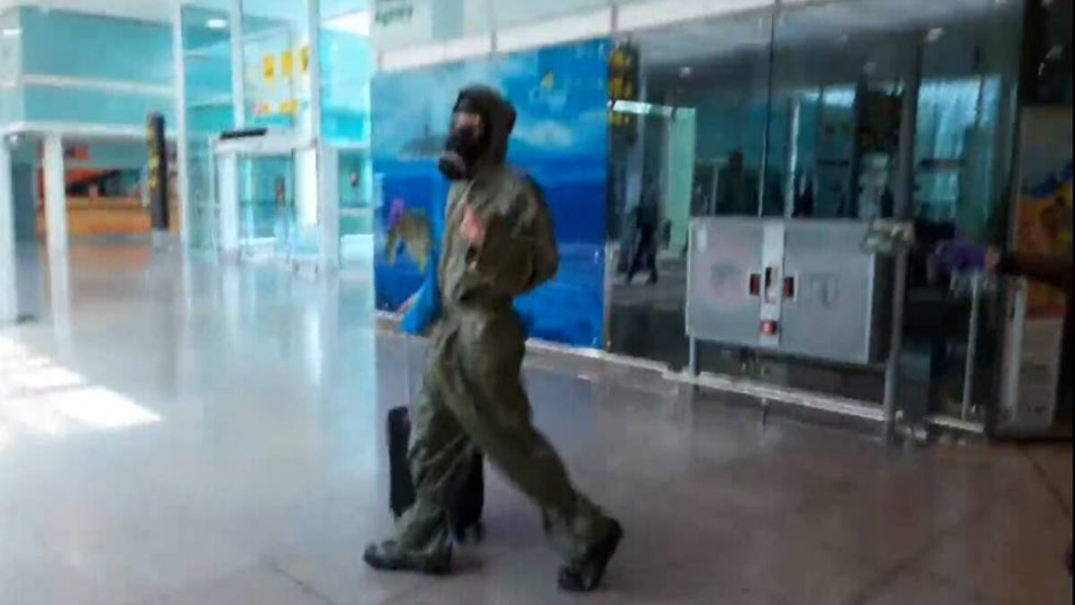 Un passatger al Prat sorprèn vestit de verd militar i amb màscara antigàs