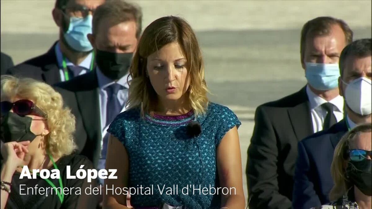“Participar avui en aquest acte és un privilegi trist. Avui retem homenatge als milers de persones que han mort a causa de la covid 19”, així començava Aroa López, la infermera supervisora de les Urgències de l'Hospital Vall d’Hebron de Barcelona, el seu discurs en l'homenatge d'Estat a les víctimes de la pandèmia. “Tant de bo jo no fos aquí pronunciant aquestes paraules. En els meus anys com a supervisora he tingut experiències molt difícils, però aquesta ens marcarà per sempre. Ha estat molt dur. Ens hem sentit impotents”, ha recordat la sanitària, que ha admès que ha “hagut d'aprendre sobre la marxa”. Aroa López ha estat la representant dels sanitaris en l'homenatge d'Estat. Treballa a Vall d’Hebron des del 2003 i és la supervisora d'Urgències de l'hospital barceloní des del 2017.