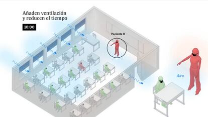 Si a més es ventila durant la lliçó (de manera natural o mecànica) i es para després d'una hora per renovar completament l'aire, el risc es desploma.