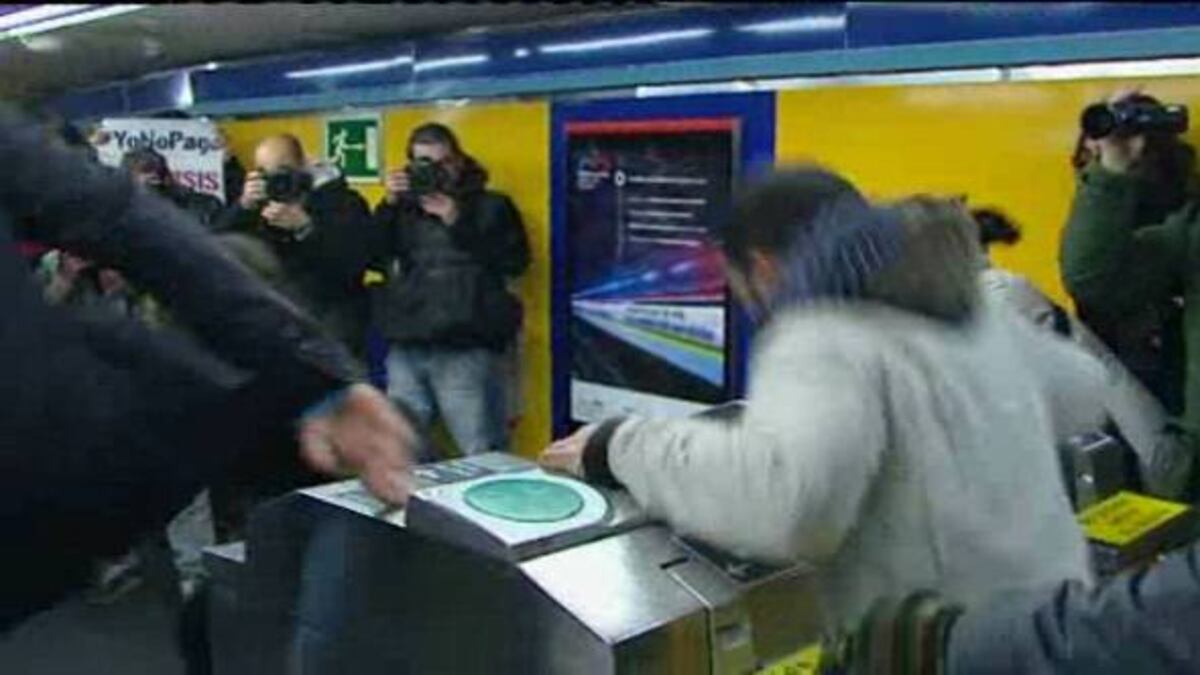 Al llegar a la estación de metro de Tirso de Molina, donde no había presencia policial, medio centenar de personas se coló al grito de "¡Yo no pago ni su crisis ni su deuda!", "que pague Urdangarin", "que pague Botella", y animaron a los usuarios a no pagar.