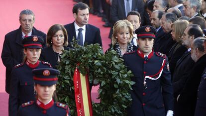 Por su parte, Botella, tras asistir al homenaje de la Comunidad, ha presidido a las diez de la mañana la ofrenda floral en la sala bajo el monumento en memoria de las víctimas del terrorismo de la Estación de Atocha. Botella, junto a Pedraza, Domínguez y la presidenta de la Fundación de Víctimas del Terrorismo, Maite Pagazaurtundua, han colocado una corona de laurel. Después, han guardado cinco minutos de silencio. La alcaldesa ha estado acompañada por el vicealcalde, Miguel Ángel Villanueva; el presidente del Pleno Municipal, Ángel Garrido; y los portavoces de PSOE, IU y UPyD, Jaime Lissavetzky, Ángel Pérez y David Ortega. Al acto -tras el que no ha habido declaraciones- han asistido también la mayoría de los concejales de Gobierno y de la corporación; la delegada del Gobierno en Madrid, Cristina Cifuentes; la consejera de Presidencia y Justicia de la Comunidad, Regina Plañiol; y el secretario de Organización del PSOE, Óscar López. También han participado representantes de la embajada de Rumanía y las empresas Renfe y Adif.